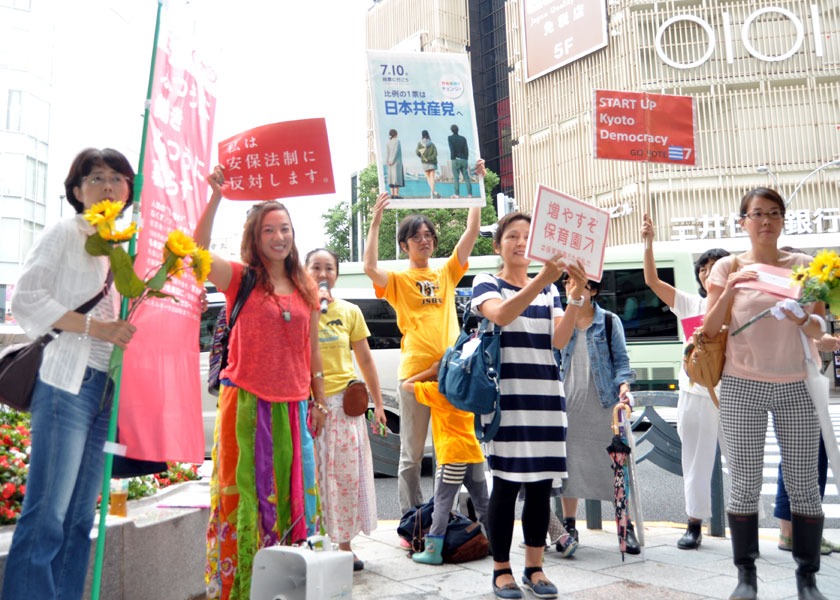 「明日は投票日。私たちの子どもを戦争に行かせない、その決意を込めた一票を日本共産党と大河原としたか候補へ!」――。多くの人でにぎわう四条河原町で9日午後、「安保関連法に反対するママの会@京都」のメンバーや子育て中の父親、日本共産党の女性後援会などが同党躍進と京都選挙区での大河原としたか候補の勝利を呼び掛けました。