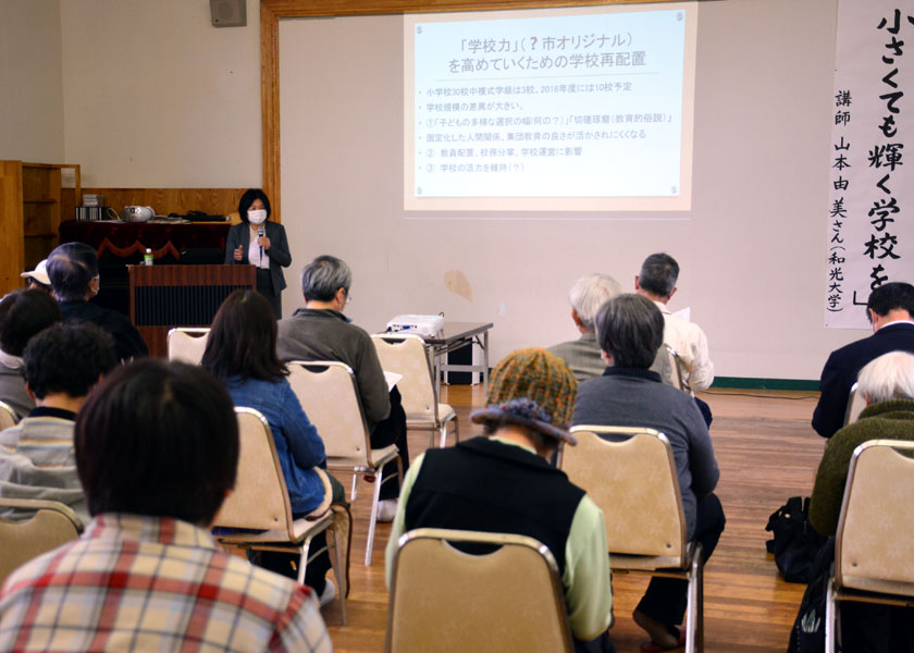 山本教授は、学校統廃合は国により政策的に推進されており、統廃合にも使える地方債の期限が21年度までであるため、全国で「駆け込み統廃合」の様な事態が起こっていると指摘。一方で、新型コロナ感染拡大の下で過密にならない小規模校の「良さが見直されている」と強調しました。