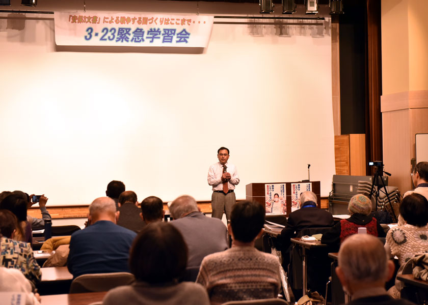 岸田政権が進める「安保3文書」による「戦争する国」づくりの問題点についての学習会が3月23日、京都市中京区のハートピア京都で行われました。憲法9条京都の会の主催(京都憲法会議協力)。