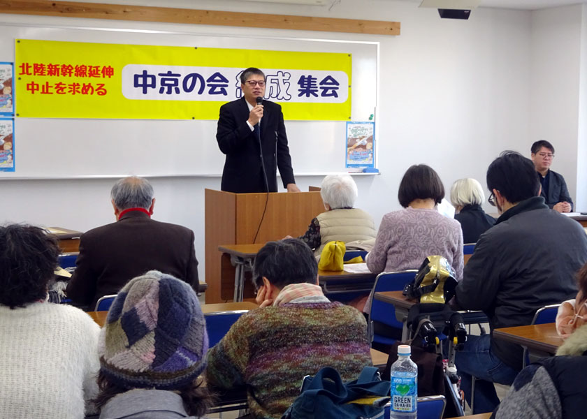 北陸新幹線延伸計画を巡り、「北陸新幹線延伸中止を求める中京の会」の結成集会が3月9日、京都市中京区内で開催され、約70人が参加しました。