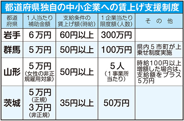 岩手、群馬、山形などの県では、賃上げを行った中小企業に対し、直接助成金を支給し、事業者から喜ばれています。岩手の支援策は、時給を上げた中小企業に一人当たり6万円を支給するもので、「真水の支援」です。