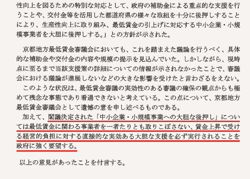 中小企業への賃上げ支援策を求める京都地方最低審議会の答申