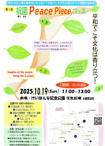 午前11時から、第1部「祝園(ほうその)Peace Piece フェス」が行われ、京都のシンガーソングライター川口真由美さんのギター弾き語りや、月桃の花歌舞団による沖縄エイサーの演舞などが行われます。