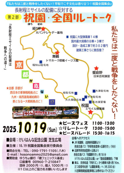 午後1時からは「祝園・全国リレートーク」。陸自・祝園分屯地、海自・舞鶴基地(舞鶴市)、米軍・経ケ岬通信所(京丹後市)の基地問題に取り組む団体や京都総評の代表をはじめ、沖縄、九州、中国・四国、関西、関東で運動している団体の代表が各地の状況と活動を報告します。