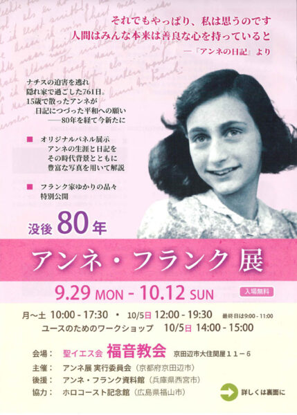 ナチスによるホロコーストの犠牲者・アンネ・フランク(1929~45)の没後80年を記念して、京田辺市の聖イエス会福音教会で12日(日)まで、「アンネ・フランク展」(同実行委員会主催)が開かれています。同教会の元牧師が館長を勤めるアンネ・フランク資料館(兵庫県西宮市)所蔵のアンネの遺品や、同教会の別の元牧師が転任先の広島県福山市で設立したホロコースト記念館の監修・制作による約20枚のパネルなどが展示されています。