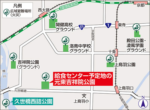 ところが、取り消しとなれば、南区南西部の広域避難場所は桂川を越えた久世橋西詰公園1カ所のみとなります(地図参照)。9月8日の総務消防委員会では、他都市(東京都、横浜市)では避難距離基準を持っていることを示し、広範囲に広域避難場所の空白地域が生じてもいいのかとただしました。
