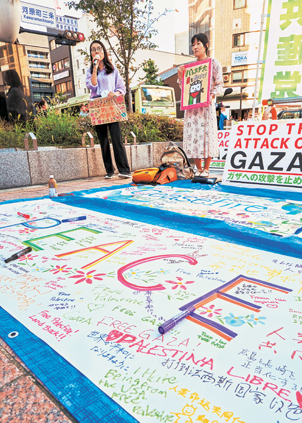 カナダでジェノサイドを止めるプロテスト運動に参加しているというカナダ人、アメリカと日本のミックスルーツを持つ女性らが、平和のメッセージを書き、行動を激励していました。