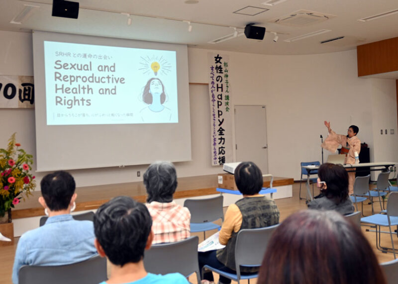 杉山さんは、自身の活動についての経過説明を、結婚、言葉や仲間との出会いなど人生の転機となった出来事を通じて紹介。その一つに「リプロダクティブ・ヘルス・ライツ(SRHR)=性と生殖に関する健康と権利」という言葉と出合い、未婚や子どもがいないことを負い目に感じていたことから解放された思いにふれて、「SRHRは自分らしく生きるためのパスポートだった」と話しました。