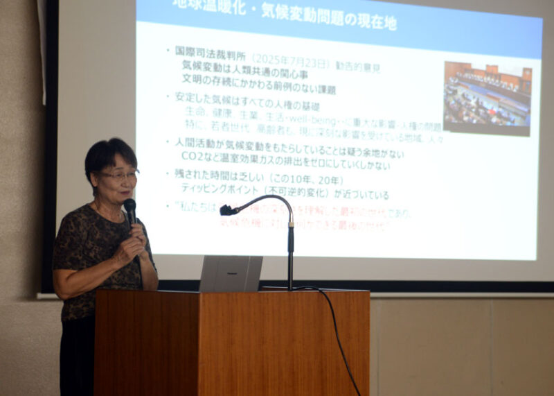 全体会では、気候ネットワーク代表の浅岡美恵弁護士が「気候変動と私たちのくらし」と題して記念講演。浅岡氏は、今夏の京都で最高気温35度以上の猛暑日が61日と過去最高を記録するなど、温暖化による危険な気候変動が誰にでも実感できる状況と指摘。「私たちの世代は気候危機の深刻さを理解した最初の世代であり、気候危機に対して何かできる最後の世代」と述べました。
