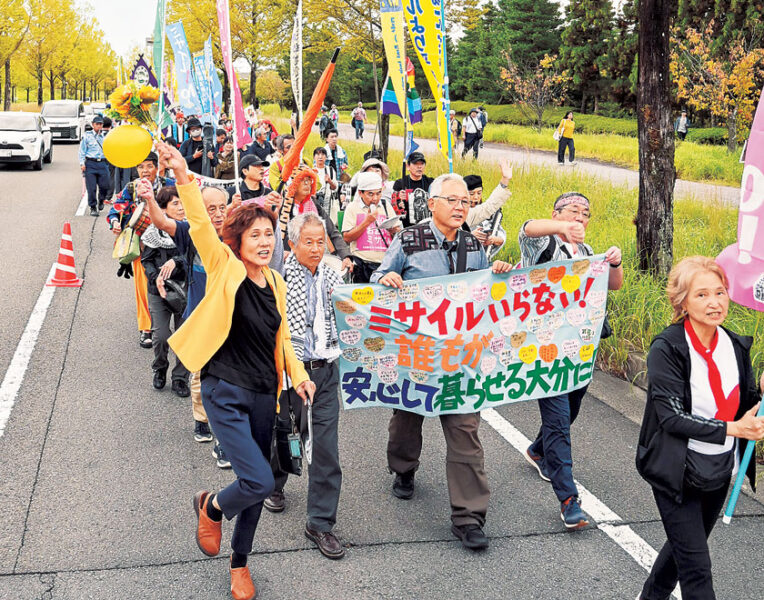 集会に先立ち、文化イベント「Peace Piece フェス」が開かれました。集会後、ピースパレードが行われ、「学研都市に、全国どこにもミサイルいらない」「戦争準備を今すぐやめよう」などと唱和しました。