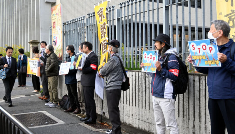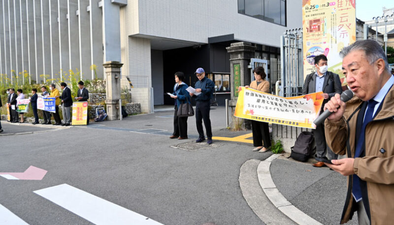 行動に先立ち行われた府庁東門での宣伝では、京都総評の梶川憲議長、京都社保協の松本隆浩事務局長、京商連の久保田憲一会長、京都医労連の坂田政春書記長、日本共産党府議団の森吉治議員の5人がスピーチしました。