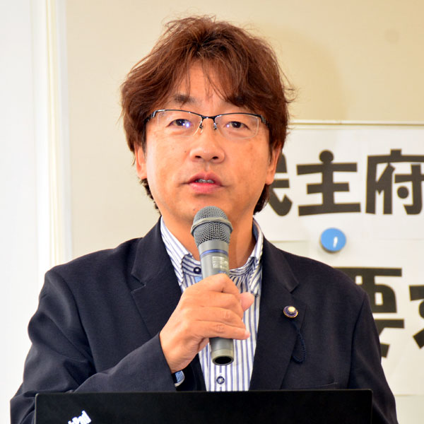 大軍拡問題について、同市の海上自衛隊・舞鶴基地への攻撃用・長射程ミサイル配備計画など日米一体の「先制攻撃の拠点化」の危険性を告発。大軍拡や原発推進など国の悪政について現知事は、「国で議論、検討されるべきもの」などと府民の願いを抑える立場に立っていると述べました。