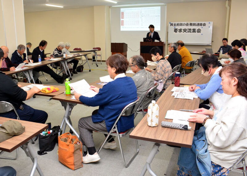 来年4月に行われる京都府知事選挙での府政転換を目指し、「府民本位の新しい民主府政をつくる会」は11月1日、舞鶴市内で府政要求交流会を開催しました。参加した市民ら35人が大軍拡反対や医療提供体制の保障、農業振興など様々な要求を出し合いました。