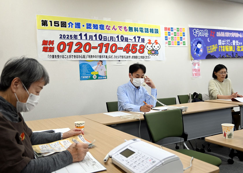 京都社会保障推進協議会、認知症の人と家族の会京都府支部、京都民主医療機関連合会など7団体は11月10日、介護に関する相談を受け付ける「介護・認知症なんでも無料電話相談」に取り組みました。