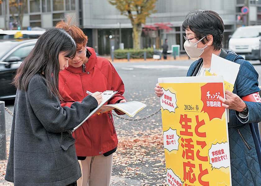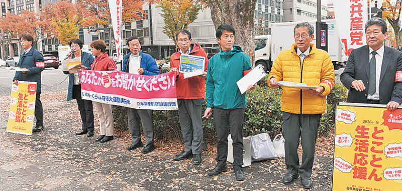 同府議団は11月26日、京都市中京区の烏丸御池交差点のハローワーク前でアンケートを実施。横断幕を掲げて賃上げを訴え、アンケートを呼びかけました。