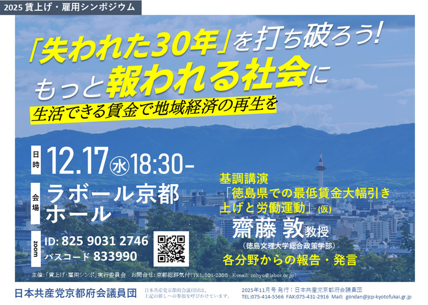 大幅な賃上げの実現をめざし、賃上げ・雇用シンポジウム「『失われた30年』を打ち破ろう もっと報われる社会に 生活できる賃金で地域経済の再生を」(日本共産党府議団や京都総評などでつくる実行委員会主催)が12月17日午後6時半から、京都市中京区のラボール京都で行われます。