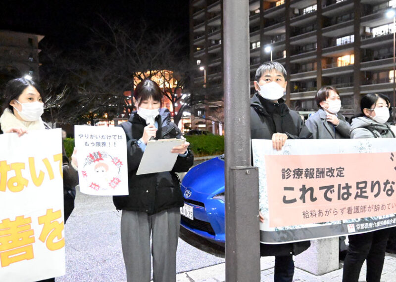 京都市立病院の看護師は、府内病院の7割が赤字経営で、看護師不足も常態化していることを告発し、「使命感と責任感で続けてきたが、もう限界です。ケア労働者の生活を守って下さい。3%の引き上げでは足りません」と訴えました。