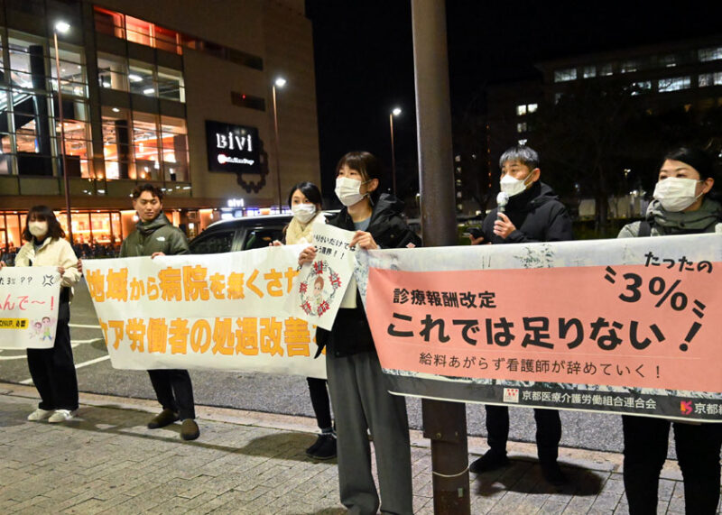 2026年度の診療報酬改定について12月19日、医療機関の人件費などに充てる「本体」の引き上げ率を3.09%にとどめる方針を政府が固めたことを受け、京都医療介護労働組合連合会と京都総評は同日、京都市中京区のJR二条駅前で宣伝し、「10%の引き上げが必要」と抗議の声を上げました。