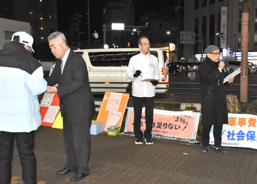 京都社保協や京都総評などがこのほど、「京都の医療を守る会」を立ち上げ、西脇隆俊知事宛てに「病床削減政策に反対し、病院などへの財政支援を求める」要望書名に取りむことを決めました。12月25日夜には、スタートとなる宣伝署名行動を京都市右京区の西院交差点前で行いました。