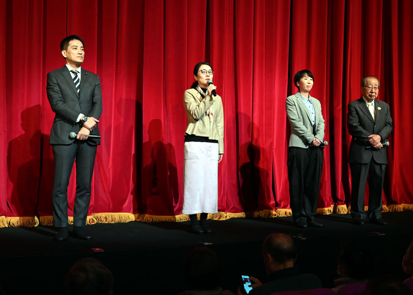 観劇のつどいではあいさつする(左から)辰巳、堀川、山口、原田の各氏(1月11日、京都市下京区・京都劇場)