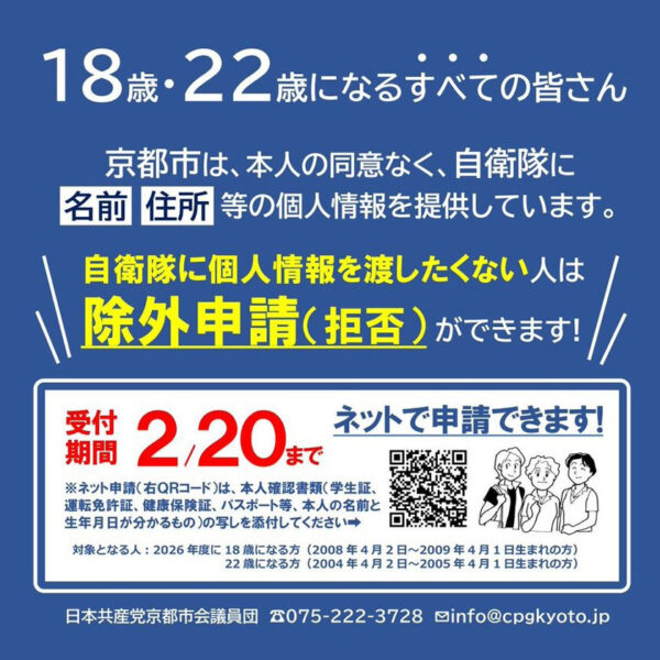京都市の青年の名簿が、本人の承諾なしに自衛隊に提供される問題で、日本共産党京都市議団は、「自衛隊に個人情報を渡したくない人は拒否できます」と名簿提供の「除外申請」手続きを市民に周知しています。申請できる期間は2月20日まで。昨年より締め切りが早くなっています。