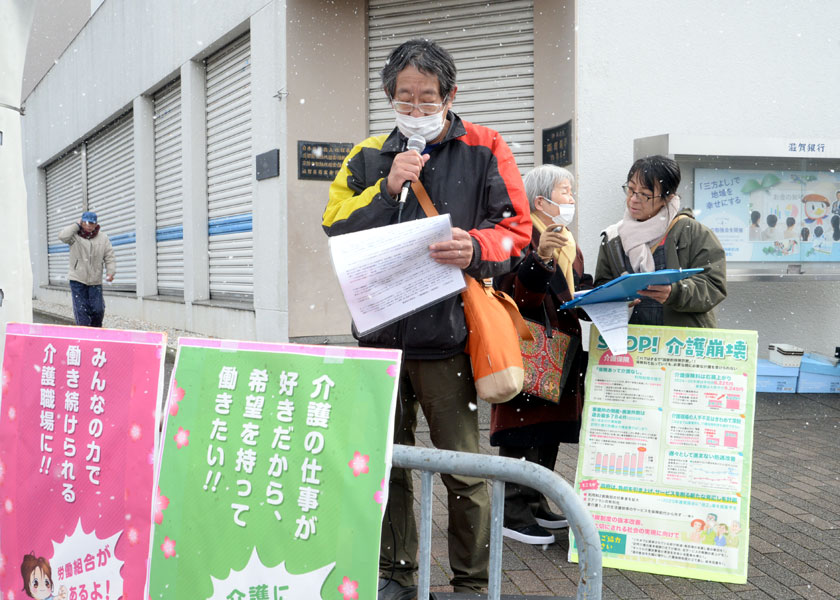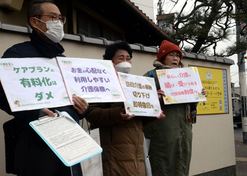 府内の介護事業所で働く職員らでつくる、京都医労連介護対策委員会は1月25日、京都市上京区の北野天満宮前で、政府が狙う介護保険改悪をストップし、介護従事者の早急な賃上げを求める国会請願署名を市民らに呼びかけました。