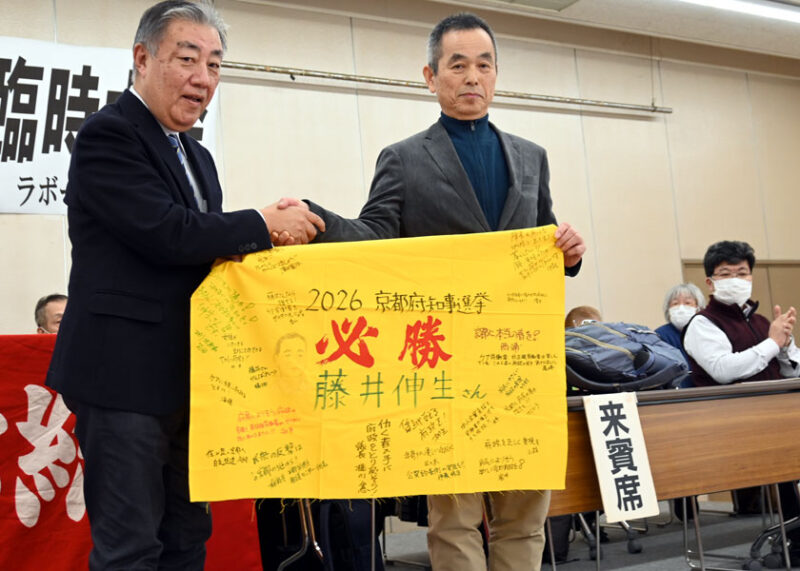 4月の府知事選では、会計年度任用職員の雇い止め撤回、給食無償化、補聴器購入助成などの暮らしの願いに「国の動向待ち」の姿勢で背を向ける現府政の転換を表明。「府政を私たちの手に取り戻そう」と立候補を表明した藤井伸生・華頂大学名誉教授の決意を歓迎し、「仲間を知事に押し上げる先頭に立とう」と述べました。