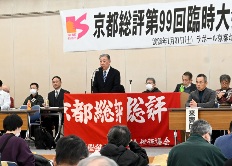 京都総評は1月31日、第99回臨時大会を京都市内で開き、「ユニオンパワー(労働組合の力)で賃上げ!」を春闘共闘のメインスローガンに掲げた26春闘方針と京都府知事選闘争方針、春闘アピールを採択しました。