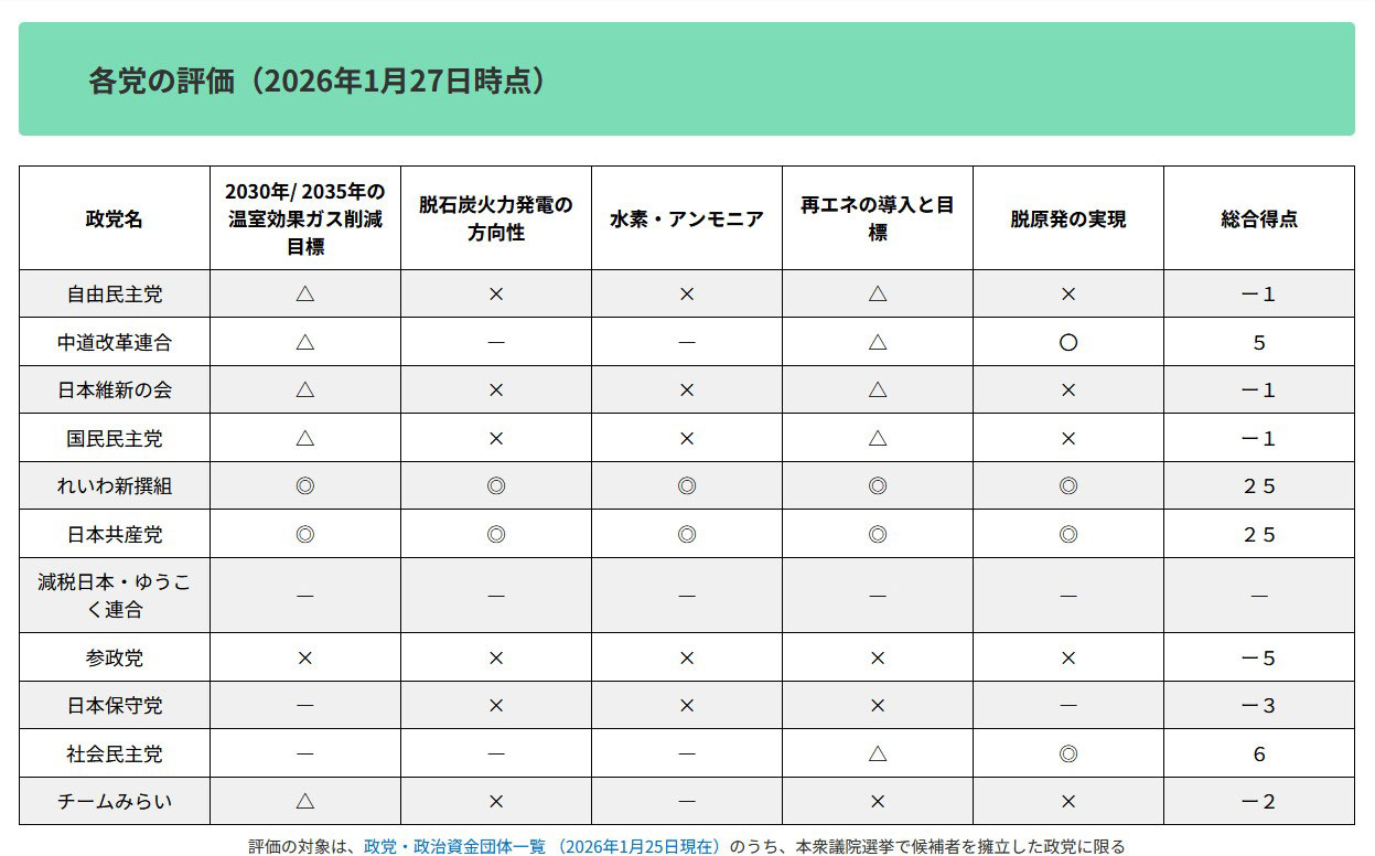 【衆院選2026】温暖化対策の公約比較・分析 共産党は満点 自民、維新などマイナス/気候ネットワークが発表