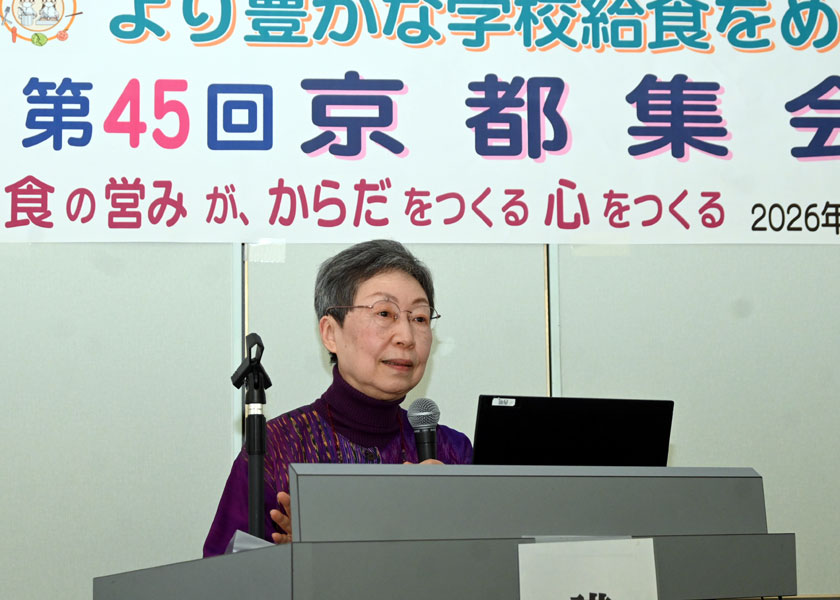 より豊かな学校給食をめざす京都連絡会は2月14日、第45回「より豊かな学校給食をめざす京都集会」を京都市内で開き、全体会で、食政策センター「ビジョン21」代表の安田節子さんが、「食べ物が劣化する日本、私たちの食の現状」と題して記念講演を行いました。