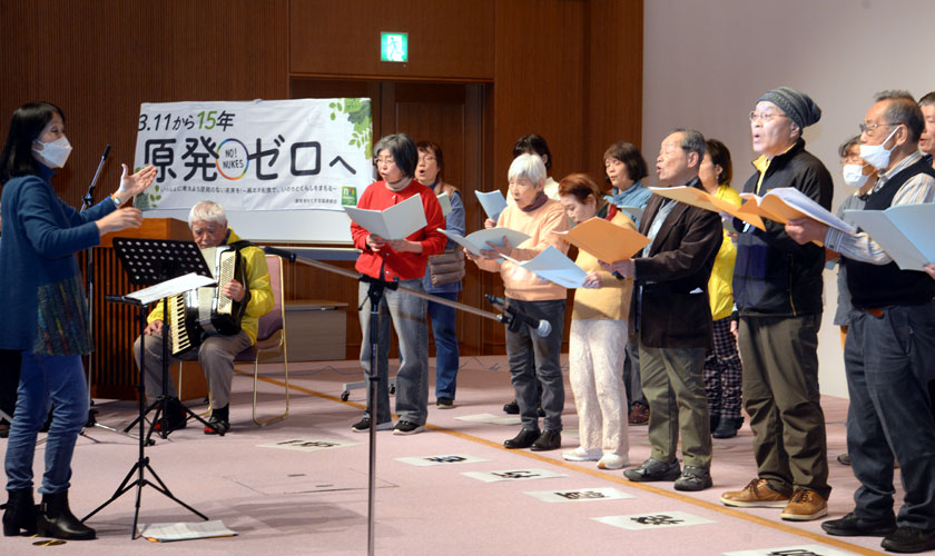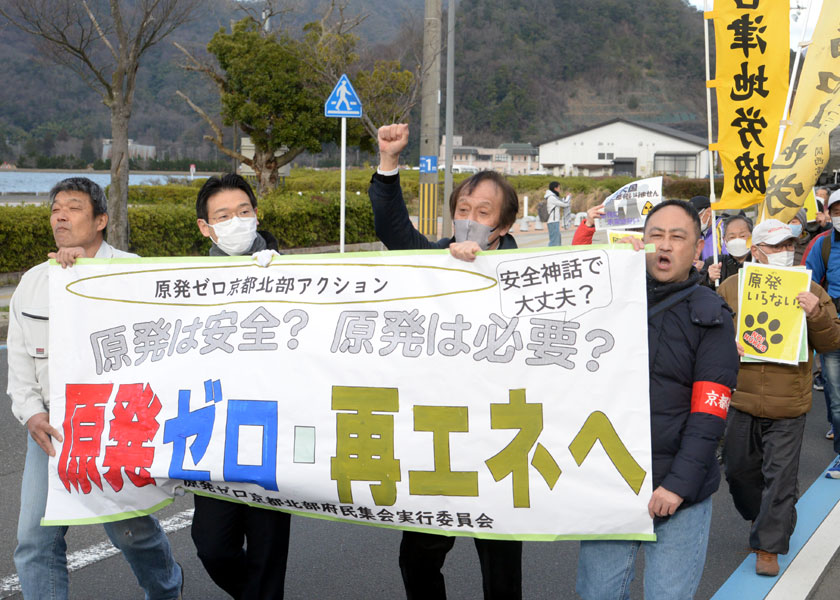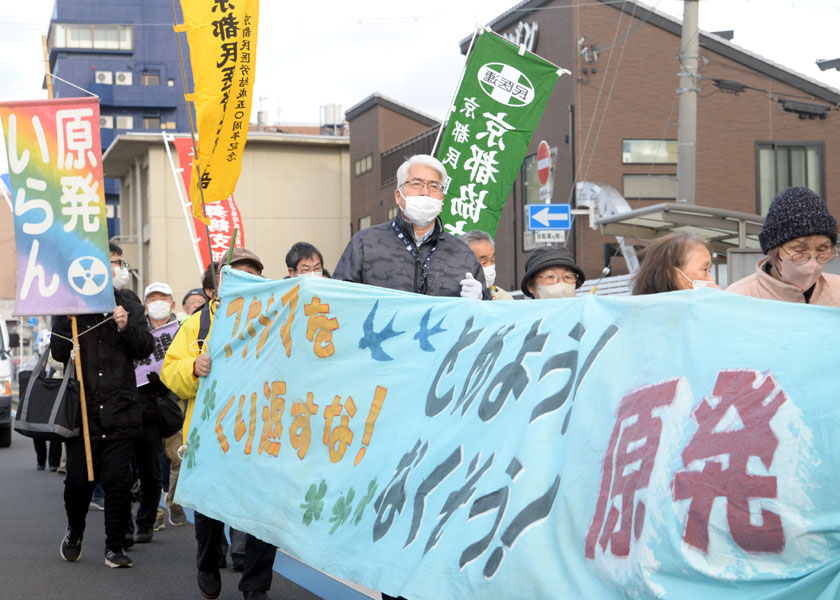 東京電力福島第一原発事故から15年を迎えるのを前に、若狭湾原発群(福井県)に隣接する京都府北部から原発ゼロを求める声を上げようと、「京都北部アクション」(同実行委員会主催)が3月8日、舞鶴市内で開催され、府北部各地から市民ら200人が参加。「安全より利益優先の原発推進姿勢にノーの声を上げ、再生可能エネルギーを広げよう」などとしたアピールを採択しました。