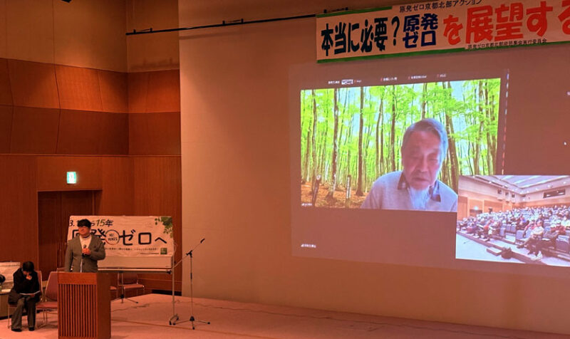 ふくしま復興共同センター代表委員の野木茂雄氏がオンラインでメッセージを寄せ、原発事故から15年を迎えるなかで、家族も暮らしも生業も、地域のコミュニティーも破壊し、取り返しのつかない被害を与え続けていると告発し、「地震や津波が多い日本で原発の運転を続けることは無謀。原発事故を二度と起こさない最大の保障は原発をゼロにすること」と訴えました。