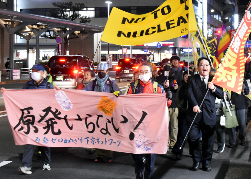 東京電力福島第1原発事故から15年を迎えた3月11日、「原発なくそう京都デモ」(下京原発ゼロネット主催)が京都市下京区で行われ、市民ら60人が参加。関西電力京都支社の周囲を歩き、「老朽原発動かすな」「命が大事」などとアピールしました。
