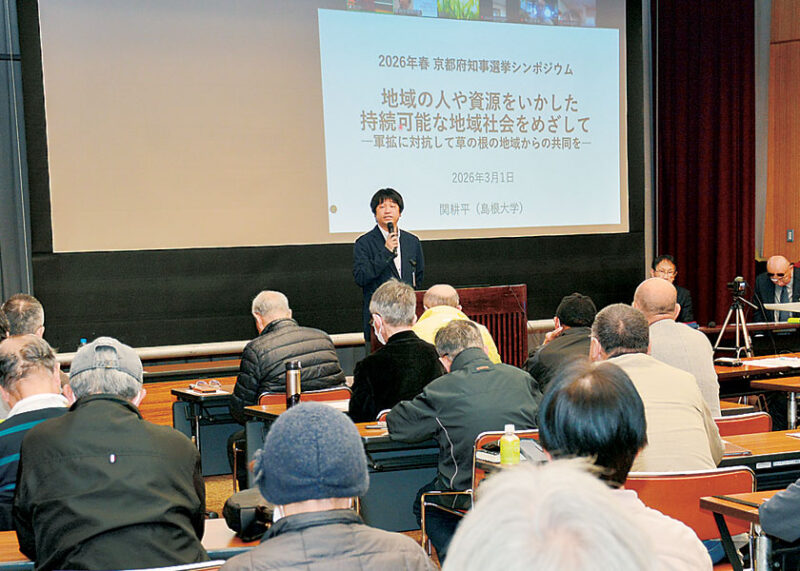 京都府知事選(3月19日告示、4月5日投票)で持続可能な地域社会・経済を実現しようと、「京都北部の地域経済と持続可能な地域社会をめざすシンポジウム」(同実行委員会、日本共産党府議団共催)が3月1日、京丹後市で開かれました。島根大学の関耕平教授が講演し、公共部門の再建が地域再生の鍵だと述べました。知事選に立候補を表明している藤井伸生さんがあいさつしました。