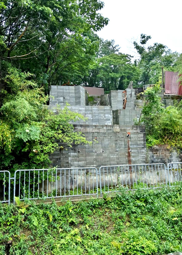 ブロック塀の上には、40年ほど前から違法に建てられた建物が立地。住民の要請や議会での追及を受け、市は昨年1月、事実上の土地所有者に除却命令を出し、同6月までには建物は撤去されました。ところが、高さ6・5㍍、幅13㍍ほどのブロック塀は放置され、直下にある民家側に崩れ落ちかねない危険な状態のままとなっていました。