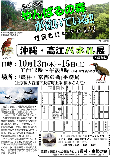 「やんばる」の自然を知ってもらいつつ、米軍北部訓練場における「ヘリパッド(オスプレイパッド)」建設の自然破壊・生活破壊の現状等を知ってもらうため、やんばるの森の動植物の写真、やんばる・北部訓練場・ヘリパッド工事の位置等が分かる地図、現地における強権的な工事進行を報じる新聞記事等をパネルにして展示。DVD「高江-森が泣いている」等の上映あり。