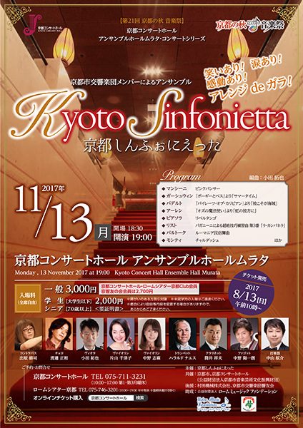 https://www.kyoto-minpo.net/event/archives/2017/11/13/post-33657.phphttps://www.kyoto-minpo.net/event/wp-content/uploads/2017/11/20171113-02.jpghttps://www.kyoto-minpo.net/event/wp-content/uploads/2017/11/20171113-02-150x150.jpg音楽京都コンサートホール11月13日(月)19時開演(18時半開場)、京都コンサートホールアンサンブルホールムラタ(京都市左京区下鴨半木町1-26。地下鉄烏丸線「北山」1番出口より南へ徒歩5分。有料Pあり)TEL075・711・3231。 出演=中野志麻(ヴァイオリン)、片山千津子(ヴァイオリン)、小田拓也(ヴィオラ・編曲)、渡邊正和(チェロ)、出原修司(コントラバス)、筒井祥夫(クラリネット)、中野陽一朗(ファゴット)、ハラルド・ナエス(トランペット)、中山航介(打楽器) プログラム=マンシーニ/ピンクパンサー、ガーシュウィン/『ポーギーとベス』より〝サマータイム〟、モンティ/チャルダッシュ、リスト/パガニーニによる超絶技巧練習曲 第3番〝ラ・カンパネラ〟 ほか ※編曲:小田拓也 一般3000円、学生(大学生以下)・シニア(70歳以上)2000円。 ※障がい者の割引あり ※未就学児入場不可。要証明書 ※全席自由 申し込み・問い合わせTEL075・711・3231(京都コンサートホール/10時~17時、第1・第3月曜休) ほか。kyomin-minpo seinen@kyoto-minpo.comAdministrator京都イベントなびスポンサーリンク