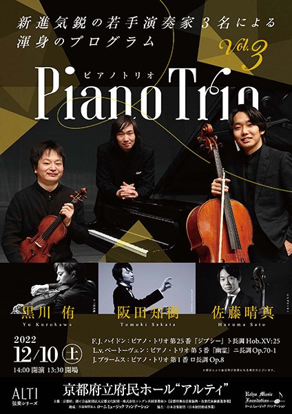 https://www.kyoto-minpo.net/event/wp-content/uploads/2022/11/20211210-04.jpghttps://www.kyoto-minpo.net/event/wp-content/uploads/2022/11/20211210-04-150x150.jpgkyomin-minpo音楽12月10日(土)14時開演(13時半開場)、京都府立府民ホールアルティ(京都市上京区烏丸通一条下ル。地下鉄烏丸線「今出川」6番出口より南へ徒歩5分。Pなし)TEL075・441・1414。※ご来場の際は公共交通機関をご利用ください 出演= 黒川侑(ヴァイオリン)、阪田知樹(ピアノ)、佐藤晴真(チェロ)プログラム= F.J.ハイドン/ピアノ・トリオ第25番『ジプシー』ト長調Hob.XV:25、L.v.ベートーヴェン/ピアノ・トリオ第5番『幽霊』ニ長調Op.70-1、J.ブラームス/ピアノ・トリオ第1番ロ長調Op.8 一般4000円(前売り3500円)、学生3000円(前売り2500円)。※全席指定※未就学児入場不可  チケット取り扱いTEL075・441・1414(府民ホールアルティ)、(ローソンチケット)Lコード:52829。 問い合わせTEL075・441・1414(府民ホールアルティ/9時~18時、第1・3月曜休、但し祝日の場合翌日休)京都のイベントの最新情報がわかる京都イベントナビ