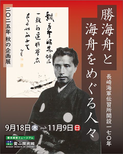 9月18日(木)~11月9日(日)10時~17時半(月曜休、但し9月22日・10月13日・11月3日は開館。11月4日休。入館は17時まで)、霊山歴史館(京都市東山区清閑寺霊山町1。市バス「清水道」または「東山安井」下車、徒歩約7分)TEL075・531・3773。