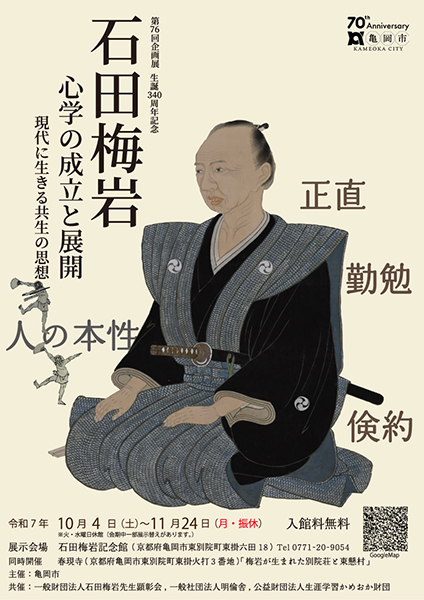10月4日(土)~11月24日(月・振休)9時半~16時(火・水曜休、祝日の場合、翌日休)、石田梅岩記念館(京都府亀岡市東別院町東掛六田18番地。「東別院グランド前」バス停下車より徒歩4分)TEL0771・20・9054。