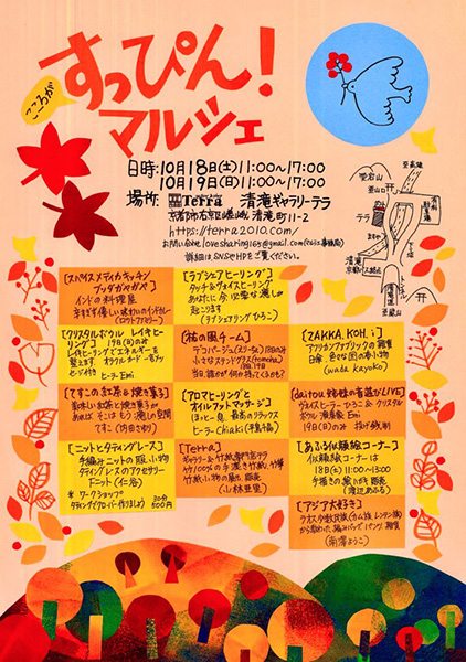 https://www.kyoto-minpo.net/event/archives/2025/10/18/post-89343.phphttps://www.kyoto-minpo.net/event/wp-content/uploads/2025/10/20251018-06.jpghttps://www.kyoto-minpo.net/event/wp-content/uploads/2025/10/20251018-06-150x150.jpg集会行事10月18日(土)・10月19日(日)11時~17時、清滝ギャラリーテラ(京都市右京区嵯峨清滝11-2。京都バス「清滝」下車徒歩5分)TEL075・204・8122。 食、クラフト、絵、ヒーリング、ライブなど、10以上の出展者が清滝テラ出店、集います。 【出店予定】●スパイス メディカ キッチン ブッダガヤガヤ(インドの料理屋)(ロウトファミリー)●てすこの紅茶&焼き菓子(内田さゆり)●ニットとタティングレース(仁谷)・ワークショップ〔タティングでクローバー作りましょう 30分 500円〕●祐の風チーム/デコパージュ(えりーちぇ)※18日(土)のみ・小さなステンドグラス(tomoha)※18日・(土)・19日(日)●ギャラリー&竹紙専門店テラ/竹100%の手漉き竹紙・竹筆竹紙小物の展示・販売(小林亜里)●ZAKKA.KOH.i/アフリカンファブリックの雑貨〔日傘、色々な国の布小物〕(wada kayoko)●あふる似顔絵コーナー/似顔絵コーナー※18日(土)11時~13時・手描きの絵ハガキ販売(渡辺あふる)●アジア大好き/ラオス少数民族(カム族、レンテン族)から教わった編みバッグ、パンツ、雑貨(南澤ようこ)●クリスタルボウル レイキヒーリング(ヒーラー Emi)※19日(日)のみ●アロマヒーリングとオイルフットマッサージ(ヒーラーChiaki〔平島千晶〕)●ラブシェアヒーリング(ラブシェアリングひろこ)●daitou姉妹の音遊びLIVE/ヴォイスヒーラー ひろこ&クリスタルボウル演奏家 Emi(投げ銭制)※19日(日)のみ。 問い合わせlovesharing165gmail.com(マルシェ事務局)。kyomin-minpo seinen@kyoto-minpo.comAdministrator京都イベントなびスポンサーリンク
