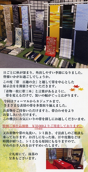 https://www.kyoto-minpo.net/event/archives/2025/10/23/post-89389.phphttps://www.kyoto-minpo.net/event/wp-content/uploads/2025/10/20251023-01.jpghttps://www.kyoto-minpo.net/event/wp-content/uploads/2025/10/20251023-01-150x150.jpg画廊・ギャラリー10月23日(木)~10月27日(月)10時~18時(最終日16時まで)、あめや藤本(京都市下京区高辻通西洞院東入ル堀之内町262-3。地下鉄烏丸線「四条」徒歩7分。Pなし)TEL075・354・3214。※ご来場の際は公共交通機関をご利用ください フォーマルからカジュアルまで、さまざまな表情の帯を多数取り揃えました。着物を持参されると、帯合わせをより楽しめます。※着物や帯の丸洗い、シミ抜き、寸法直しの相談も承ります※立礼席にて、抹茶の呈茶あり 問い合わせTEL075・354・3214(あめや藤本)。kyomin-minpo seinen@kyoto-minpo.comAdministrator京都イベントなびスポンサーリンク