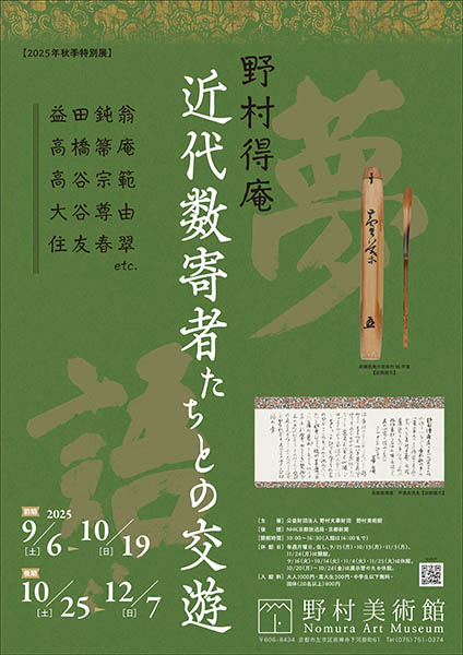 https://www.kyoto-minpo.net/event/wp-content/uploads/2025/11/20251025-06.jpghttps://www.kyoto-minpo.net/event/wp-content/uploads/2025/11/20251025-06-150x150.jpgkyomin-minpo美術館【後期】10月25日(土)~12月7日(日)、10時~16時半(月曜休、但し11月3日・11月24日は開館。11月4日・11月25日、休。入館は16時まで)、野村美術館(京都市左京区南禅寺下河原町61。市バス「南禅寺・永観堂道」下車徒歩約5分。有料Pあり)TEL075・751・0374。 得庵と近代数寄者たちの茶の湯を通しての交遊は、残された得庵の自会記・他会記のほか、高橋箒庵の著書『大正茶道記』などから垣間見ることができます。展示では、多くの近代数寄者の中でも得庵が深く交流した、益田鈍翁・高橋箒庵・高谷宗範・大谷尊由・住友春翠に注目し、当時の茶会記をもとに得庵が彼らを招いた、または得庵が担当した茶会の再現。 《主な展示作品》 【後期】〔篠園会 第170回〕頓阿筆 三首懐紙 時雨 落葉 祝言・木耳籠・本願寺井戸茶碗 など〔籜龍会 第45回〕十四屋宗悟筆 紹鷗より茶事消息・存星猿桃香合・瀬戸玉柏手茶入 銘 槙葉 など〔高谷宗範追善茶会〕沢庵宗彭筆 夢語・砂張塁座雷紋釣花入・堆黒花籠香合・青磁獅子摘水指 など〔近代数寄者作品ほか〕益田鈍翁筆 野村得庵宛消息・大谷尊由筆 懐紙・種村肩衝茶入 など  大人1000円、大高生300円、中学生以下無料。※呈茶席あり/10時~16時。椅子席の茶室にて上生菓子付き抹茶をいただけます。1000円。問い合わせTEL075・751・0374/FAX075・751・0586(野村美術館)。京都のイベントの最新情報がわかる京都イベントナビ