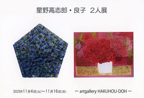 11月4日(火)~11月16日(日)11時~18時(月曜休。最終日17時まで)、アートギャラリー博宝堂(京都市左京区岡崎円勝寺町91-99。地下鉄東西線「東山」1番東口より徒歩6分)TEL075・771・9401。