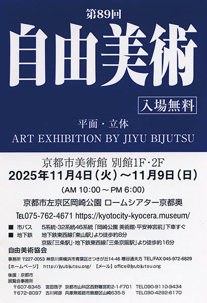 11月4日(火)~11月9日(日)10時~18時、京都市美術館 別館1F・2F(京都市左京区岡崎最勝寺町13〔岡崎公園内〕。市バス「京都会館美術館前」下車すぐ。Pなし、周辺に有料あり)TEL075・762・4671。