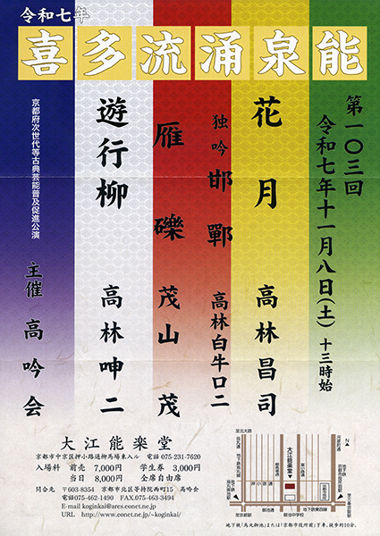 https://www.kyoto-minpo.net/event/wp-content/uploads/2025/10/20251108-01.jpghttps://www.kyoto-minpo.net/event/wp-content/uploads/2025/10/20251108-01-150x150.jpgkyomin-minpo伝統11月8日(土)13時開演、大江能楽堂(京都市中京区押小路通柳馬場東入ル橘町646。地下鉄東西線「京都市役所前」より徒歩10分。Pなし、周辺に有料あり)TEL075・231・7620。 「花月」高林昌司、「邯鄲」高林白牛口二、「雁礫」茂山茂、「遊行柳」高林呻二 8000円(前売り7000円)、学生3000円。※全席自由。 申し込み・問い合わせTEL075・462・1490/FAX075・463・3494/✉koginkai@ares.eonet.ne.jp(高吟会)。京都のイベントの最新情報がわかる京都イベントナビ