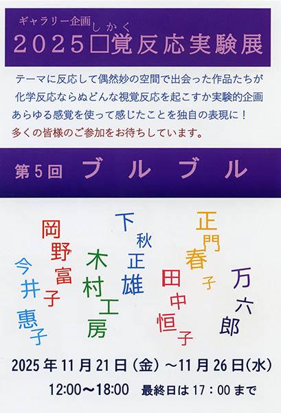 https://www.kyoto-minpo.net/event/wp-content/uploads/2025/11/20251121-03.jpghttps://www.kyoto-minpo.net/event/wp-content/uploads/2025/11/20251121-03-150x150.jpgkyomin-minpo画廊・ギャラリー11月21日(金)~11月26日(水)12時~18時(最終日17時まで)、スペース妙(みょう)(京都市左京区松ヶ崎堀町1-1。地下鉄烏丸線「松ヶ崎」1番出口より東へ約7分)TEL090・6605・0656。 テーマに反応して偶然、妙の空間で出会った作品たちが、化学反応ならぬどんな視覚反応を起こすか実験的企画。あらゆる感覚を使って感じたことを独自の表現に! テーマ=「ブルブル」 出品者=今井惠子、岡野富子、木村工房、下秋正雄、田中恒子​、​正門春子、万六郎 問い合わせTEL090・6605・0656(space 妙)。京都のイベントの最新情報がわかる京都イベントナビ