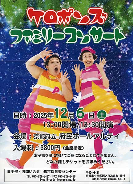 https://www.kyoto-minpo.net/event/wp-content/uploads/2025/12/20251206-03.jpghttps://www.kyoto-minpo.net/event/wp-content/uploads/2025/12/20251206-03-150x150.jpgkyomin-minpo音楽12月6日(土)13時半開演(13時開場)、京都府立府民ホールアルティ(京都市上京区烏丸通一条下ル。地下鉄烏丸線「今出川」6番出口より南へ徒歩5分。Pなし)TEL075・441・1414。※ご来場の際は公共交通機関をご利用ください あそびあり、ミュージックパネルあり、簡単で楽しい体操あり、素敵な歌ありの楽しいコンサート。 3800円。※全席指定※子ども膝上鑑賞不可※プレゼント、差し入れ等、不可 申し込み・問い合わせTEL075・822・3437(㈱京都音楽センター/平日12時~17時)。京都のイベントの最新情報がわかる京都イベントナビ