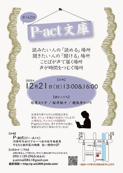 https://www.kyoto-minpo.net/event/archives/2025/12/21/post-89763.phphttps://www.kyoto-minpo.net/event/wp-content/uploads/2025/10/20251221-01.jpghttps://www.kyoto-minpo.net/event/wp-content/uploads/2025/10/20251221-01-150x150.jpg舞台12月21日(日)13時/16時開演(開場は各開演時間の30分前)、P-act(京都市上京区河原町通今出川下ル梶井町448 清和テナントハウス2F。京阪鴨東線「出町柳」より西に徒歩10分、または市バス「河原町今出川」下車すぐ。Pなし)。 読みたい人の「読める」場所。聞きたい人の「聞ける」場所。ことばが声で届く場所。声が時間をつむぐ場所。月に1回、P-actが、そんな「P-act文庫」に早変わり。毎月メニューを替えて、出演者を募り朗読公演。P-actならではの、月イチ手作り公演。 出演=松尾えり子・桜井桜子・飛鳥井かゞり 500円。※要予約 申し込み・問い合わせTEL090・1139・2963、✉p.actmail0841@gmail.com(ピーアクト・飛鳥井)。kyomin-minpo seinen@kyoto-minpo.comAdministrator京都イベントなびスポンサーリンク