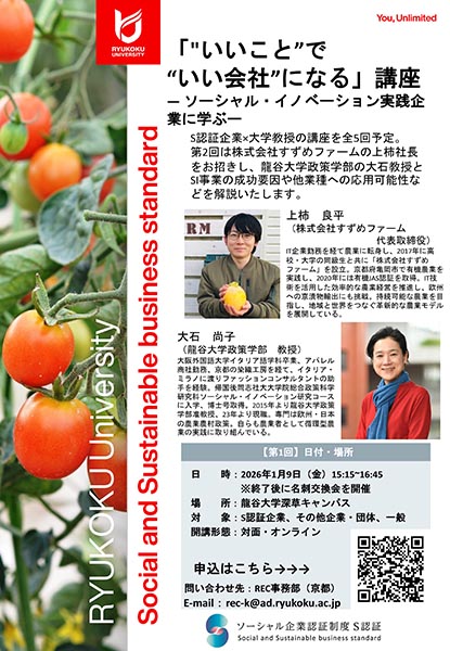 S認証企業である株式会社すずめファームの上柿良平社長をお招きし、龍谷大学政策学部の大石尚子教授とともに、ソーシャル・イノベーション事業の成功要因や他業種への応用可能性について語ります。